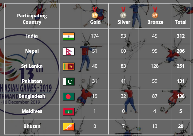 यसैगरी पाँचौ स्थानमा रहेको बंगलादेशले १९ स्वर्ण, ३२ रजत र ८७ कांस्य जितेको छ ।