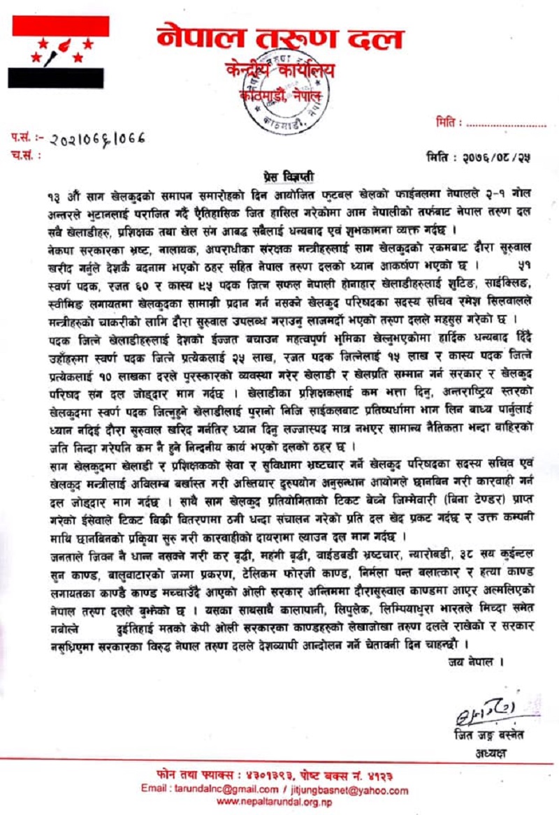 तरुण दलका अध्यक्ष जितजंग बस्नेतले बुधबार विज्ञप्ति जारी गरी यस्तो माग गरेका हुन् ।