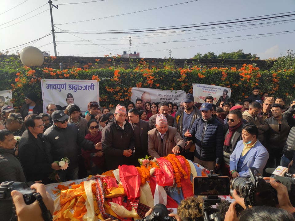 त्यहाँ पुगेर स्वर्गीय भट्टराइको पार्थिव शरिरमा माल्यार्पण गर्न कलाकारदेखी नेता तथा सर्वसाधारणको भिड लागेको छ ।