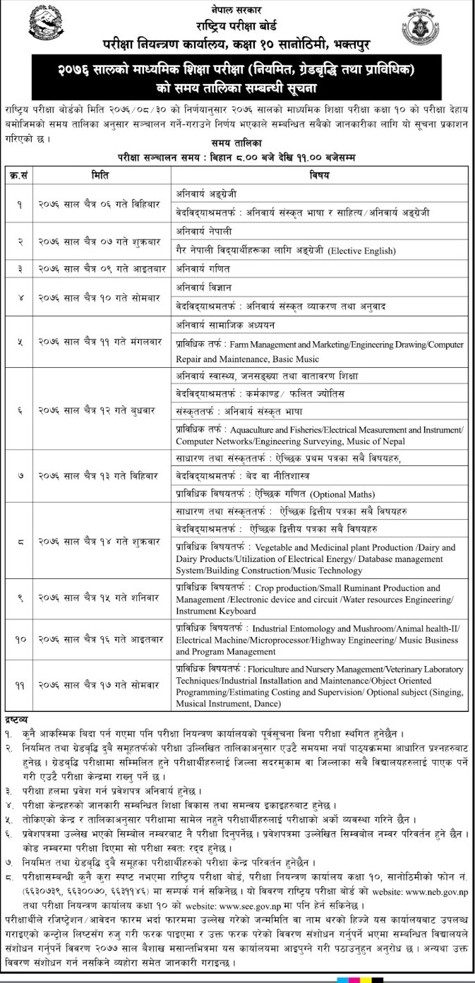 एसईई परीक्षा चैत ६ देखि, परीक्षा तालिका सार्वजनिक (सूचनासहित)