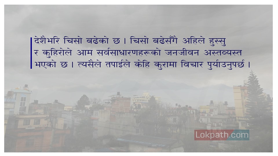 “केहि दिनसम्म तराईका अधिकांश क्षेत्रमा लगातार हुस्सु तथा कुहिरो लाग्ने र दिउँसो पनि घाम नलाग्ने सम्भावना छ” मौसमविद् पौडेलले लोकपथसँगको कुराकानीमा भने, हिजो देखि तराईका अधिकांश क्षेत्रमा कुहिरो र हुस्सु लाग्न सुरु भएको हो,देशैभरि परेको पानीका कारण चिसो अत्याधिक बढ्न थालेको हो, अझै केहि दिनसम्म कुहिरो र हुस्सु तराईमा रहिरहनेछ । उनले भने— “काठमाडौं सहित केहि पहाडी जिल्लाहरुमा विहान कुहिरो र हुस्सु लागे पनि दिउँसो घाम लाग्छ, तर चिसो भने धेरै हुन्छ ।”
