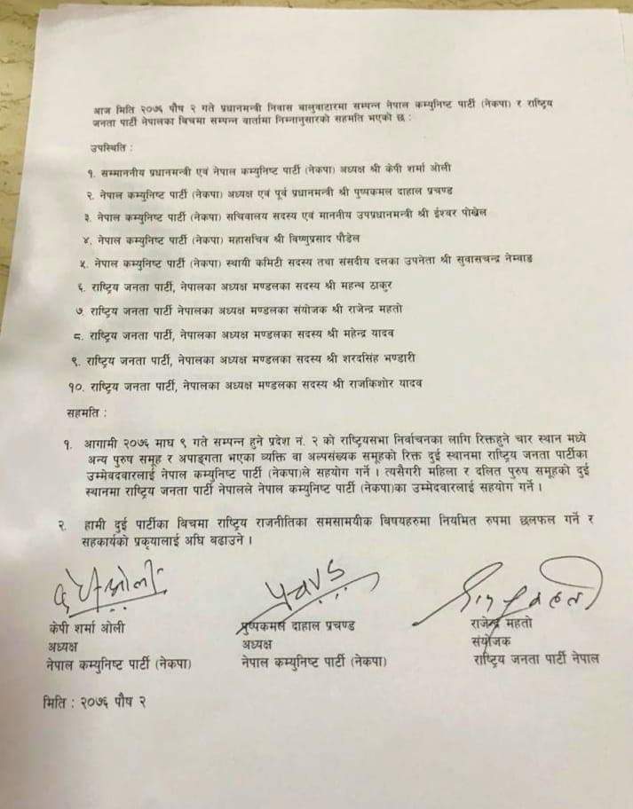 प्रधानमन्त्री निवास बालुवाटारमा आज भएको दुई दलबीचको छलफलमा राष्ट्रियसभा निर्वाचनका लागि रिक्त हुने चार स्थानमध्ये अन्य पुरुष समूह र अपाङ्गता भएका व्यक्ति वा अल्पसंख्यक समूहको रिक्त दुई स्थानमा राष्ट्रिय जनता पार्टीका उम्मेदवारलाई नेकपाले सहयोग गर्ने सहमति भएको छ ।