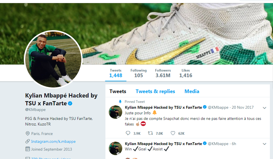 ह्याकरले एमबाप्पेको ट्वीटर ह्याक गर्दै एकाउन्टको नामःकेलियन एमबाप्पे ह्याक बाई टीएसयु एक्स फ्यान टार्टे राखेको छ । तर अहिलेसम्म ह्याकरले एमबाप्पेको पोस्टहरु भने हटाएको छैन ।