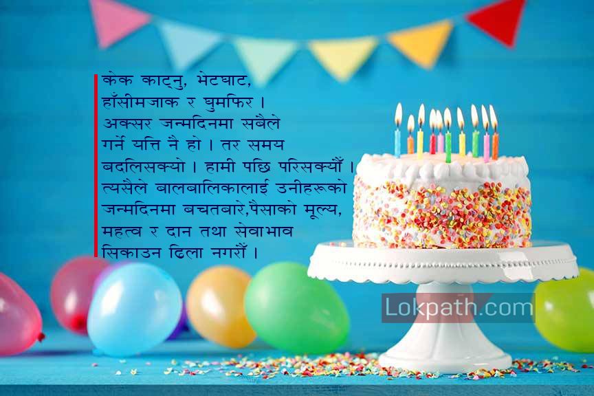 जन्मदिनका लागि खासगरी बालबालिकाहरु बढि रमाउने गर्दछन् । यसरी बालबालिकाको जन्मदिन मनाउँदा दिइने उपहारमा हुने होडबाजीका कारण जन्मदिनलाइ केही फरक शैलीबाट मनाउनु पर्ने देखिन्छ । जस्तै जन्मदिनमा काटिने केक, बाडिने चक्लेट, मिठाइ तथा सजावटका लागि खरिद गरिने विविध चिज बस्तुहरुबाट खर्च कटौती गरि केहि नयाँ कामको थालनी गर्न सकिन्छ । जसले बालबालिकाको मनमा सामाजिक भावना पैदा गरोस वा त्यहि रकमबाट उनीहरुले पछिल्ला दिनहरुमा केही नयाँ कामहरु गर्न सकुन।