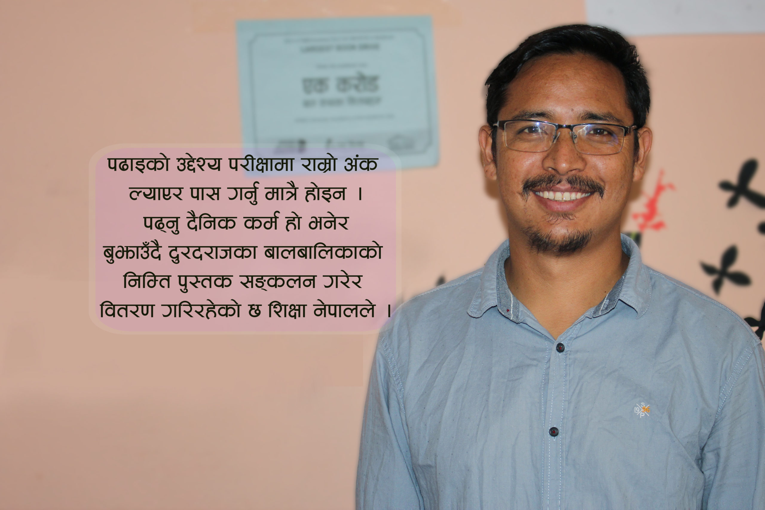 पढ्नुको अर्थ कोर्सका ठेलीसँग घुलमिल हुनु होइन र पढाइको उद्देश्य परीक्षामा राम्रो अंक ल्याउनु र सजिलै जागिर पाउनु या त करियरमा सफलता हात पार्नु मात्र होइन । पढाइ करले होइन रहरले हुन्छ भन्दै विगत ७ वर्षदेखि बालबालिकाकाका निमित्त पुस्तक सङ्कलन गरेर नेपालका कुनाकन्दरामा वितरण गरिरहेको छ शिक्षा नेपालले ।