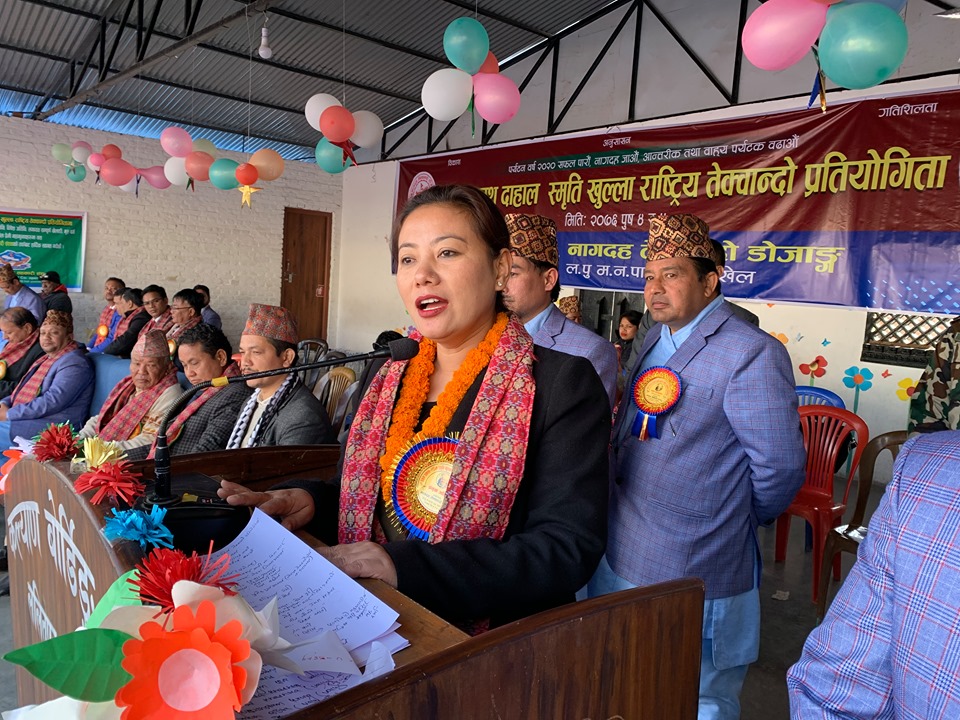 नागदह तेक्वान्दो डोजाङले आयोजना गरेको उक्त प्रतियोगिताको उद्घाटन गर्दै खानेपानी मन्त्री बिना मगरले राष्ट्रलाई चिनाउन खेलकुद क्षेत्रले महत्वपूर्ण योगदान गर्ने भएकाले राज्यले खेल क्षेत्रमा लगानी बढाउनुपर्ने बताउनुभयो ।