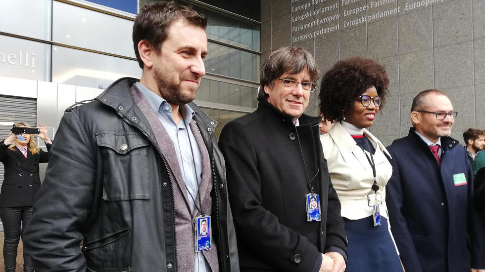 “It’s a day of joy, not only for us, but all those who believe in a Europe founded on the will of its citizens,” Puigdemont said, wearing his blue parliamentary pass.