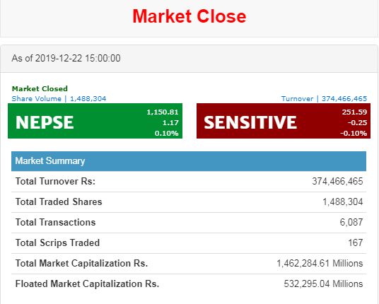 साताको पहिलो दिन आइतवार कुल १६७ वटा कम्पनीको शेयर कारोबार भएको थियो । जसको १४ लाख ८८ हजार कित्ता शेयर करिब ३७ करोड ४४ लाख रुपैयाँ कारोबार भएको नेप्सेले जनाएको छ । आज कारोबारमा आएका समूहमध्ये बैंक, व्यापार, हाइड्रोपावर, वित्त, निर्जीवन बीमा र जीवन बीमा समूहबाहेक सबै समूह बढेका छन् । साथै आज परिसूचक र कारोबार शेयर संख्या बढे पनि कारोबार रकम अघिल्लो दिनको तुलनामा घट्न पुगेको छ ।