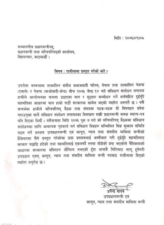काठमाडौं – समाजवादी पार्टीका अध्यक्ष एवम् उपप्रधानमन्त्री समेत रहेका कानून, न्याय तथा संसदीय मामिलामन्त्री उपेन्द्र यादवले राजीनामा दिएका छन् ।