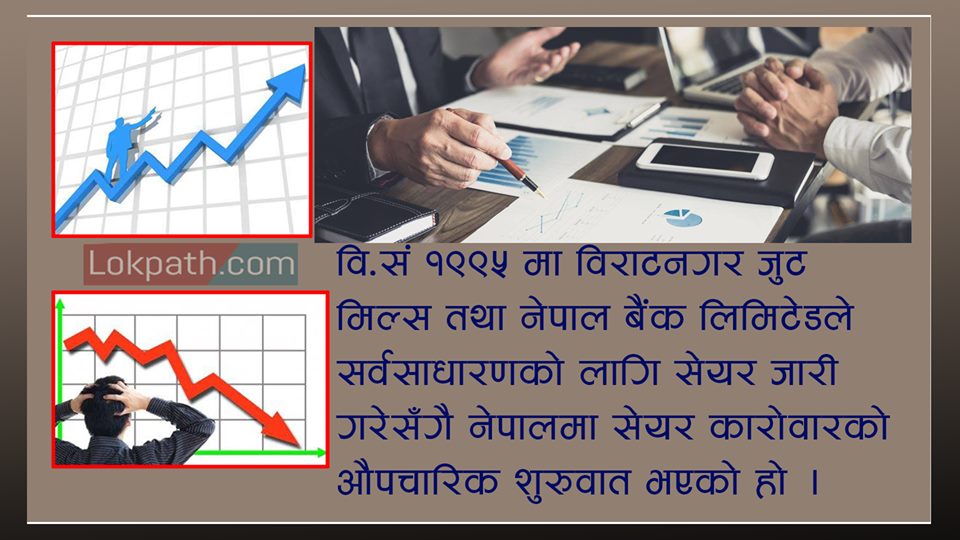 विं स. १९९५ मा विराटनगर जुट मिल्स तथा नेपाल बैंक लिमिटेडले सर्वसाधारणको लागि सेयर जारी गरेसँगै नेपालमा सेयर कारोवारको औपचारिक शुरुवात भएको हो । साथै पछिल्लो समय मानिसहरु आफुले कमाएको मोटो रकम सेयरमा लगानी गर्ने गरेको पाइन्छ । सेयर कारोबारबाट सडकबाट महलमा पुगेका उदाहरण बजारमा प्रशस्त पाइन्छ । साथसाथै सेयरकै कारण महलबाट सडकमा ओर्लिनु परेको उदाहरण पनि बजारमा प्रशस्त मात्रामा पाइन्छ । धेरै जसो मानिसहरु अरुको लहै लहैमा लागेर सेयरमा लगानी गर्दा घाटामा परिने विज्ञहरु बताउँछन् । सेयर कारोबार नेपाली उखान जाने व्यापार नजाने अपार भने जस्तै हो ।