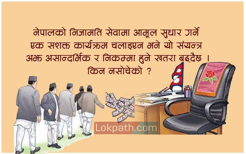 अन्त्यमा : नेपालको निजामति सेवामा आमूल सुधार गर्ने एक सशक्त कार्यक्रम चलाइएन भने यो संयन्त्र अझ असान्दर्भिक र निकम्मा हुने खतरा बढ्दैछ । बेलायतले मार्गरेट थ्याचरको प्रधानमन्त्रीत्वकालमा एउटा त्यस्तै आमूल सुधारको कार्यक्रम चलाएको थियो । नेपालजस्तै श्रीलंका, मलावी र ग्वाटेमालाजस्ता विकासोन्मुख मुलुकहरूले आ–आफ्ना कर्मचारी संयन्त्रहरूमा गम्भीर उपचारात्मक सुधार ल्याएर ठीक गरे । अब नेपालले पनि त्यस्तो कार्यमा ढिलाई गर्नै हुँदैन ।
