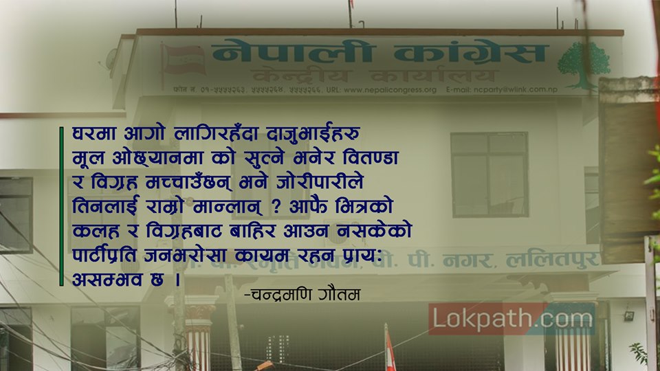 मध्यमार्गबाट च्यूत हुनु नै यस पार्टीको दुर्दिनको कारक बन्यो । सभापति देउबाको दुर्भाग्य के हुँदैछ भने गिरिजाप्रसादले गरेका गल्तीको सजाय पनि देउवालाई दिन खोज्ने एकथरी पक्ष छ । यस्तो अवस्थामा पार्टीभित्र शुद्धीकरण र सुदृढीकरण अभियान चलाउने सभापतिको रुपमा देउवाको योगदान रह्यो भने अब उनले जित्ने राजनीति त्यही हुनेछ । आफ्नो पार्टीभित्र विद्यमान लथालिङ्ग र भताभुङ्ग अवस्थालाई सम्हालिदिन कोही आउँदैन । त्यसैले कसैलाई पर्खिनुपर्ने वा साइत र जोखाना हेरिरहनु पर्ने आवश्यकता छैन । पार्टी फर्काउनै नसकिने बर्वादीतिर जाकियो भने कोही बलियो र जिवित रहँदैन । कांग्रेसमा सद्बुद्धि आउने हो भने यति गर्नैपर्छ । बरु सिंग–जुरो पलाउला तर बुद्धि बङ्गारो कहिल्यै नपलाउने हो भने रामराम मात्र भन्नुबाहेक अरु के उपाय रहन्छ र ! – चन्द्रमणि गौतम