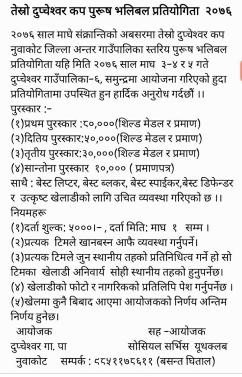 काठमाडौं । नुवाकोटको दुप्चेश्वर गाउँपालिकामा माघे संक्रान्तिको अवसरमा भलिवल प्रतियोगिता हुने भएको छ । यहि माघ ३, ४ र ५ गते तेस्रो दुप्चेश्वर कप पुरूष भलिबल प्रतियोगिता हुन लागेको हो ।