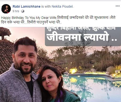 सामाजिक सञ्जाल फेसबुकमा वर्थ डे मनाएको फोटोसहित स्टाटस पोस्ट गर्दै उनले लेखेका छन् । ह्याप्पी वर्थ डे माई डियर वाईफ ! तिमीलाई जन्मदिनको धेरै धेरै शुभकामना । मैले दिन सके भन्दा धेरै….तिमीले पाउनुपर्ने भन्दा धेरै…..