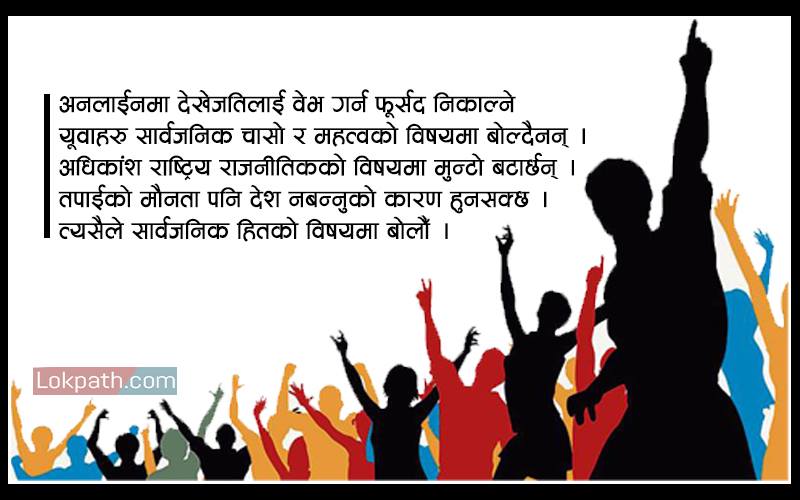तपाई सामाजिक विषयमा कत्तिको बोल्नुहुन्छ ? समसामयिक र सामाजिक विषयमा तपाईले बोल्नुभएन भने अहिले देखेको अवस्था भन्दा झनै र्जर्जर अवस्था हुनसक्छ । त्यसैले आफ्नो गाउँ ठाउँ, टोल, छिमेक, समाजमा, देश, अन्तर्राष्ट्रिय स्तरमा र विश्व ब्रह्माण्डमा भएका परिवर्तन, उतारचढाव, उपलब्धि र भवितव्यबारे चासो राख्नुपर्छ । चनाखो हुनुपर्छ ।