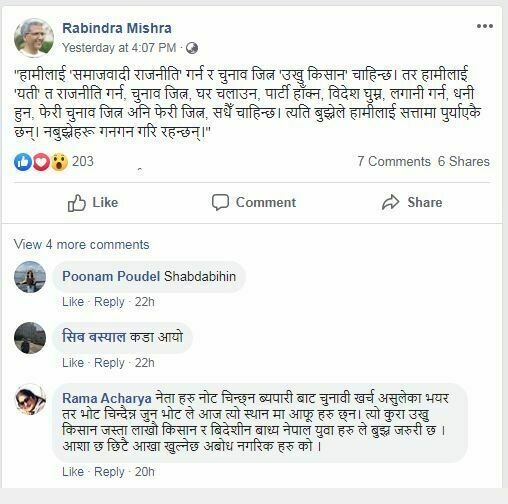 ”हामीलाई समाजवादी राजनीति गर्न र चुनाव जित्न उखु किसान चाहिन्छ। तर हामीलाई यती त राजनीति गर्न, चुनाव जित्न, घर चलाउन, पार्टी हाँक्न, विदेश घुम्न, लगानी गर्न, धनी हुन, फेरी चुनाव जित्न अनि फेरी जित्न, सधैँ चाहिन्छ। त्यति बुझ्नेले हामीलाई सत्तामा पुर्याएकै छन्। नबुझ्नेहरू गनगन गरि रहन्छन् ।”