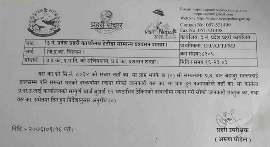 काठमाडौं । सरुवा भएपनि चितवन नछोडेका एसपी दानबहादुर मल्ललाई १२ घण्टा भित्र तोकिएको स्थानमा हाजिर हुन निर्देशन दिइएको छ ।