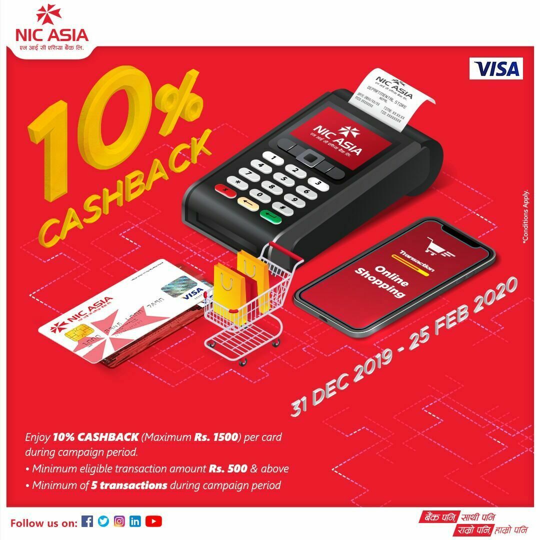 काठमाडौं । एन आई सी एशिया बैंक लिमिटेडले आफ्ना डेविट तथा क्रेडिट कार्डवाहक ग्राहकहरुलाई नयाँ वर्ष २०२० को अवसरमा योजना ल्याएको छ । उक्त योजना अनुसार ग्राहकहरुले Visa कार्ड मार्फत खरिदमा भुक्तानी गर्दा १० प्रतिशत तथा अधिकतम १५ सय सम्म क्यासव्याक प्रदान गर्ने भएको छ ।