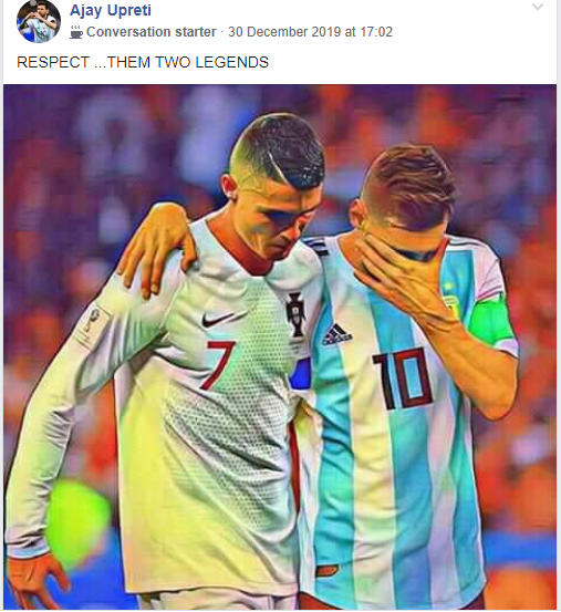 रोनाल्डो र मेस्सी समर्थकबीच सधै उत्कृष्ट खेलाडीको विषयमा खटपट हुने गर्छ । सामाजिक संजालमा विभिन्न ग्रुप पेज खेलेर उत्कृष्ट खेलाडी रोनाल्डो की मेस्सी भन्ने विषयमा खटपट हुने गर्छ ।