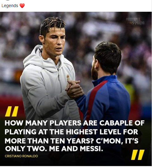रोनाल्डो पोर्चुगलका लागि महान र सर्वोत्कृष्ट फुटबलरको रुपमा चिनिन्छन् । मेस्सी अझैपनि म्याराडोनाको छायामा रहेका छन् जसले गर्दा     मेस्सीको नाम म्याराडोनापछि मात्र आउने गर्छ ।