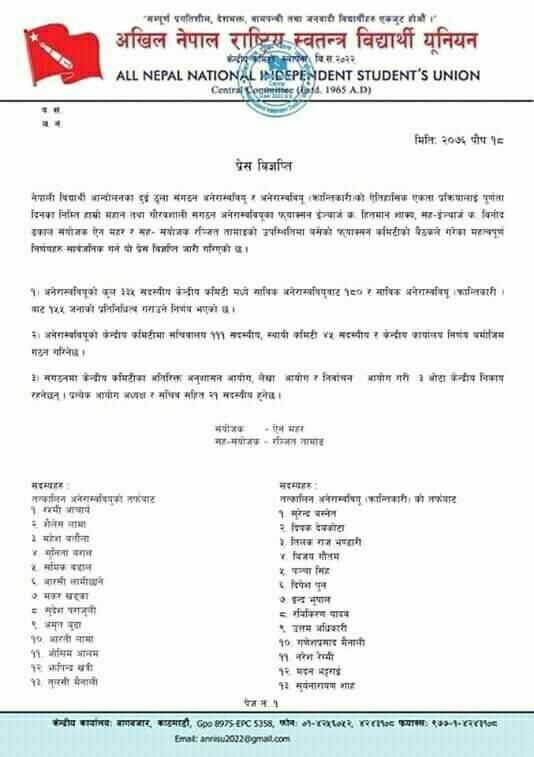 काठमाडौं । सत्तारुढ दल नेपाल कम्युनिस्ट पार्टी (नेकपा) को भ्रातृ संगठन (अनेरास्ववियू) ले केन्द्रिय कमिटिको एकता प्रक्रिया टुंगाएको छ।