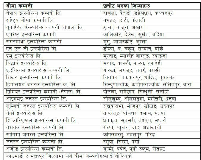 काठमाडौं र भक्तपुरमा भने सबै कम्पनीले आफ्नो इच्छा अनुसार सेवा विस्तार गर्न सक्नेछन् । उनले नेपालमा रहेका २० वटा निर्जीवन बीमा कम्पनीको व्यवसाय विस्तार र सरकारले किसानहरुलाई दिने बीमा अनुदानको प्रभावकारी कार्यान्वयनका लागि समितिले यस्तो निर्देशन दिएको बताए ।