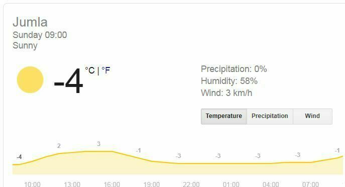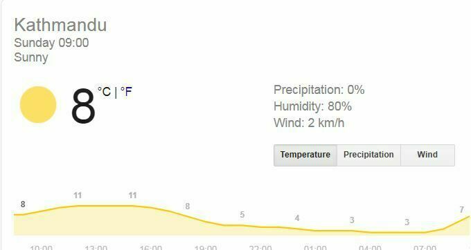 आइतबार राति पनि उच्च पहाडी तथा हिमाली भूभागहरुमा आंशिक बदली रही बाँकी क्षेत्रमा भने मौसम सफा नै रहने बताइएको छ । मौसममा आएको अदलबदलका कारण हवाई उडान समेत प्रभावित बनेको थियो । अहिले काठमाडौको तापक्रम ९ डिग्री सेल्सीयस छ । जुम्लाको माईनस ४ (-4) छ भने मुस्ताङको माईनस १५ (-15) डिग्री सेल्सीयस छ । अत्याधिक चिसो बढेपछि मानिसहरु समूहमा भेला भएर आगो ताप्दै गरेको पनि देख्न सकिन्छ ।