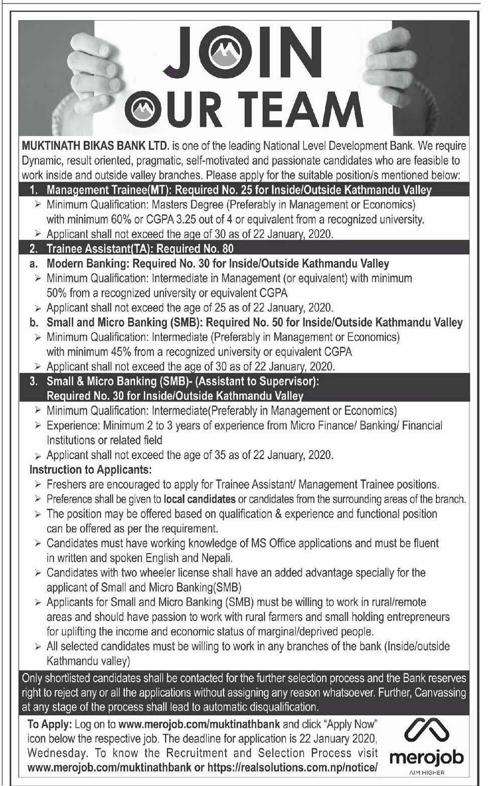 काठमाडौं । मुक्तिनाथ विकास बैंक लिमिटेडले विभिन्न पदका लागि कर्मचारी माग गरेको छ । बैंकले विभिन्न ३ पदका लागि १३५ जना कर्मचारी माग गरेको हो। बैंकका अनुसार माग गरिएका कर्मचारीहरु काठमाडौं उपत्यका भित्र तथा उपत्यका बाहिरका लािग माग गरेको हो ।