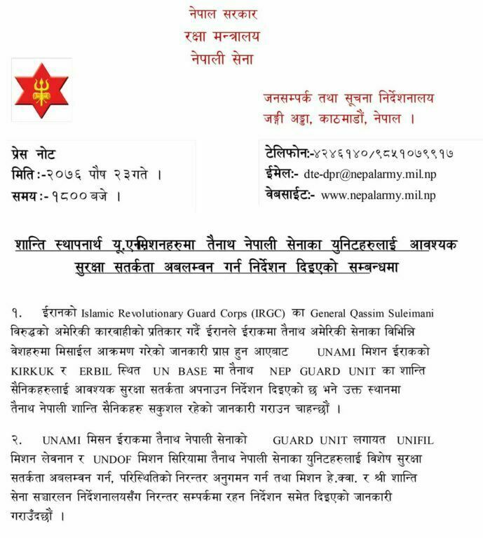 इराकमा रहेका गार्ड युनिट, लेवनन र सिरियामा रहेका शान्ति सेना सकुशल रहेको र उनीहरूलाई थप सतर्क रहन सेनाले बुधबार सर्कुलर गरेको छ। अमेरिकाको प्रतिकार गर्दै इरानले इराकमा तैनाथ अमेरिकी सेनाका विभिन्न वेशमा मिसाइल आक्रमणपछि नेपाली सेना पनि झस्केको हो।
