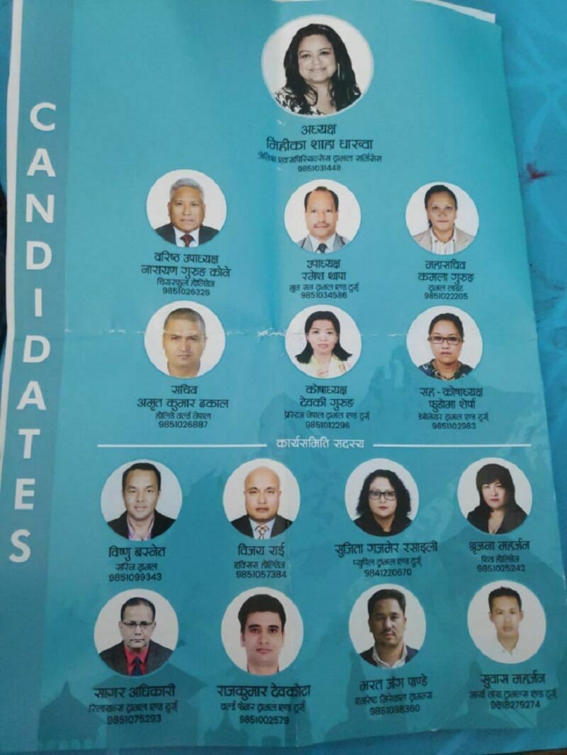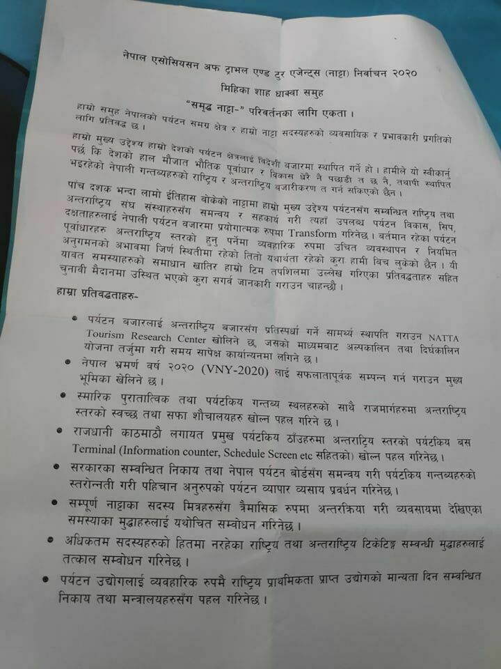 नाट्टाको आगामी निर्वाचनको लागि अध्यक्षमा मिहिका शाह धाक्वा (जेनिथ एक्सपिरियन्सेस ट्राभल सर्भिसेस) को रहेकी छिन् । भने उनको समुहका तर्फबाट वरिष्ठ उपाध्यक्षमा नारायण गरुङ कोने (चियरफुल होलिडेज), उपाध्यक्ष रमेश थापा (मुन सन ट्राभल्स एण्ड टुर्स), महासचिवमा कमला गुरुङ (ट्राभल लाईट) , सचिवमा अमृत कुमार ढकाल (होलिडे वल्र्ड नेपाल), कोषाध्यक्षमा देवकी गुरुङ (प्रेष्टिज नेपाल ट्राभल्स एण्ड टुर्स), सह-कोषाध्यक्ष फुडोमा शेर्पा (डेबोनेयर टभल एण्ड टुर्स्) लगायतले पदाधिकारीमा उम्मेद्वारी दिएका छन् । भने सदस्यहरुमा विष्णु वस्नेत (सरिन ट्राभल), विजय राई (एक्सिस होलिडेज), सुजिता गजमेर रसाइली (प्युपिल ट्राभल श्रृजना होलिडेज), सागर अधिकारी (रिलायन्स ट्राभल एण्ड टुर्स्), राजकुमार देवकोटा (वर्ड फेवर ट्राभल एण्ड टुर्स), भरत जंग पाण्डे (एभरेष्ट मिरेकल ट्राभल्स), सुवास महर्जन (आर्या तारा ट्राभल्स एण्ड टुर्स) लगायतले सदस्य पदमा उम्मेद्वारी दिएका छन् ।