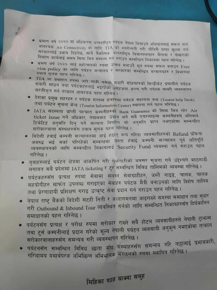 धाक्वा समुहले पर्यटन क्षेत्रलाई विदेशी बजारमा स्थापित गर्नको लागि आफ्नो उम्मेद्वारी रहेको जनाएको छ । साथै निर्वाचन विजयी भएमा भ्रमण वर्ष सफल बनाउन सहयोग गरिने, काठमाडौं लगायतका मुख्य पर्यटकिय ठाँउहरुमा अनराष्ट्रिय पर्यटकिय बस सञ्चालन गरिने तथा राष्ट्र बैंकको विदेशी मुद्रा सटही नीति र अध्यागमनमा आइराख्ने समस्या समाधान साथै सुधार गरिने प्रतिवद्धता रहेको समेत जनाएका छन् । त्यतिमात्र नभएर पर्यटनसँग सम्बन्धित विविध छाता सँघ संस्थाहरुसँग समन्वय गरि नाट्टालाई प्रभावकारी गरिमामय साथै यथार्थपरक अभिछिन्न अभिवावक संगठनको रुपमा स्थापित गराइने समेत प्रतिवद्धता जनाएका छन् ।