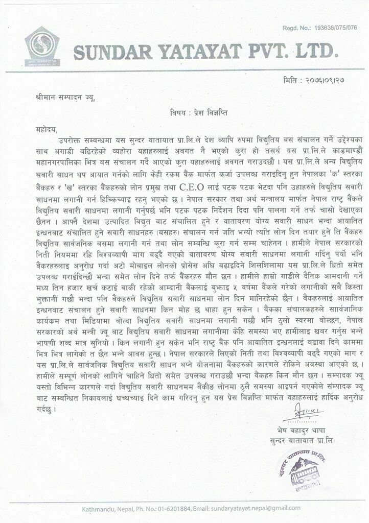 “इन्धनबाट सञ्चालित हुने सवारी साधनमा हुने सवारी साधनहरु संचालन गर्न जति भन्यो त्यति लोन दिन तयार हुने ति बैंकहरु विद्युतिय सार्वजनिक बसमा लगानी गर्न तथा लोन सम्बन्धी कुरा गर्न सम्म चाहेनन्”, विज्ञप्तीमा भनिएको छ ।
