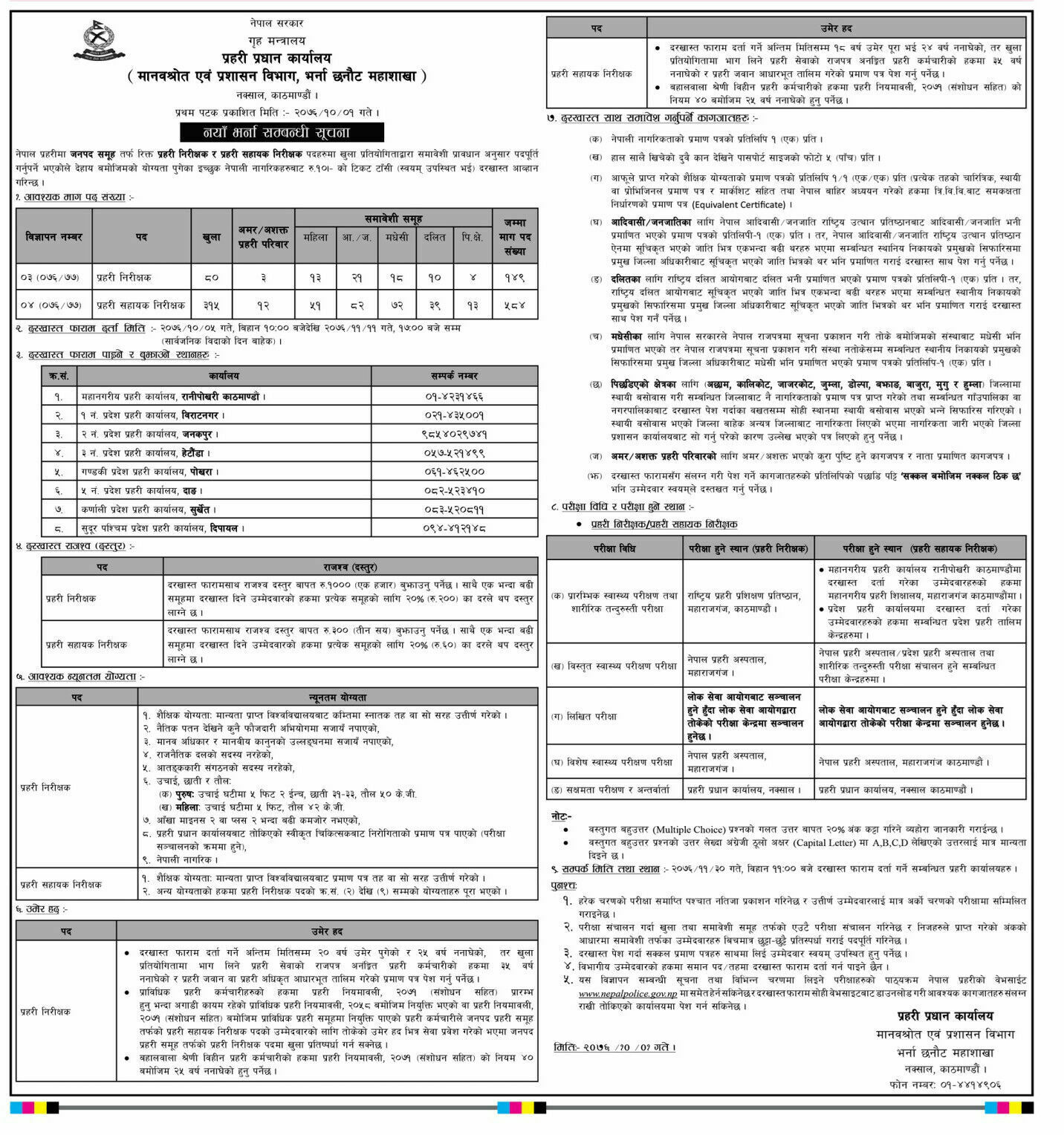 काठमाडौँ । नेपाल प्रहरीले प्रहरी निरीक्षक (इन्सपेक्टर) र प्रहरी सहायक निरीक्षक (असई) पदमा भर्ना खुलाएको छ ।