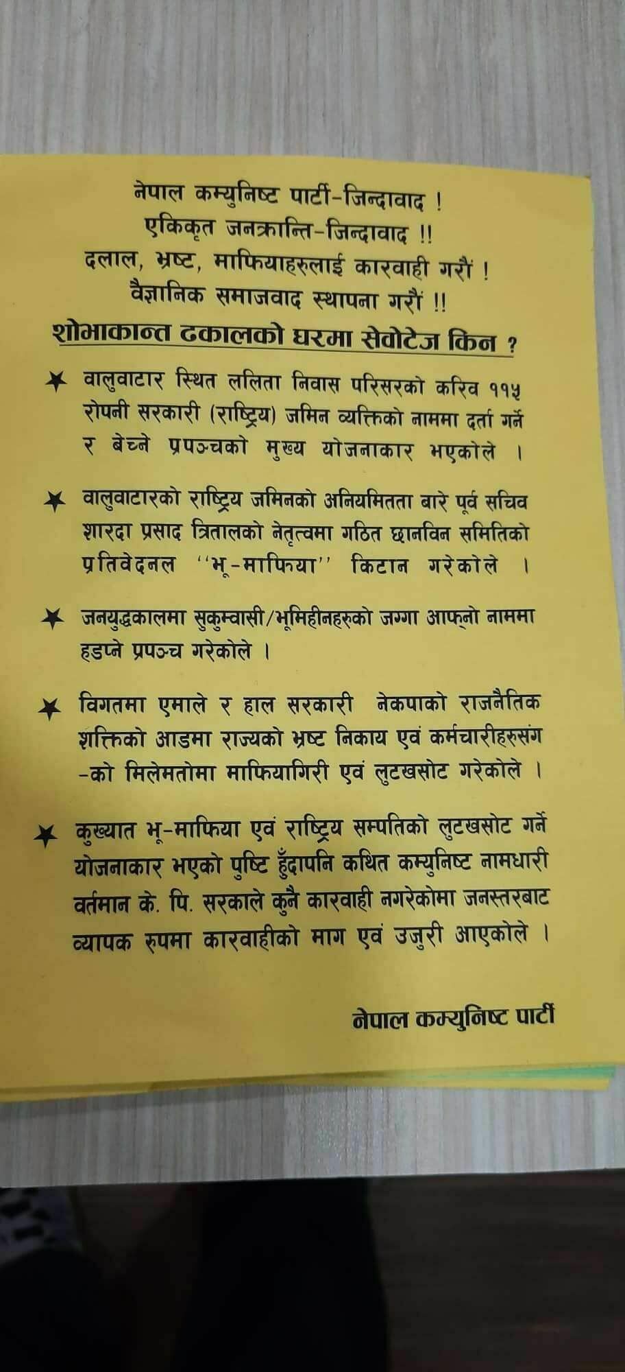 शोभाकान्तको घरमा विस्फोटको कारण प्रष्ट्याउँदै विप्लव समूहले एक पर्चा पनि सार्वजनिक गरेको छ ।