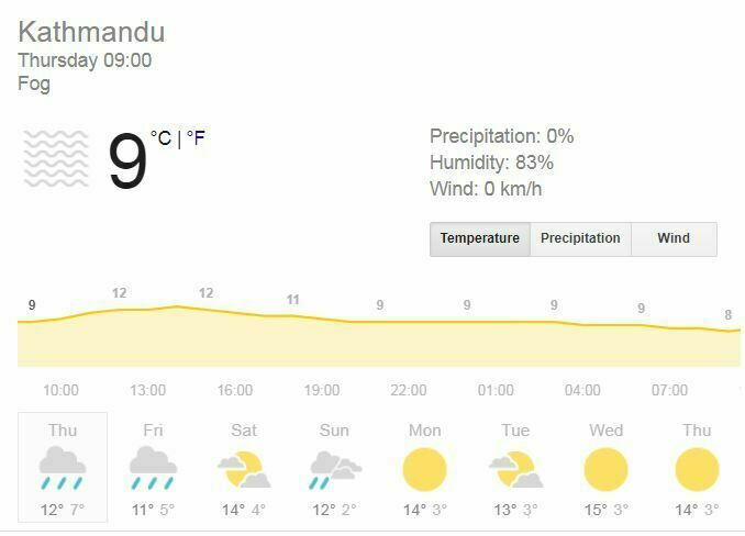आज काठमाडौँ उपत्यकामा न्युनतम तापक्रम ५ दशमलव २ डिग्री सेल्सियस रहेको छ । दिउँसो काठमाडौँको अधिकतम तापक्रम १६ देखि १८ डिग्री पुग्ने अनुमान छ।