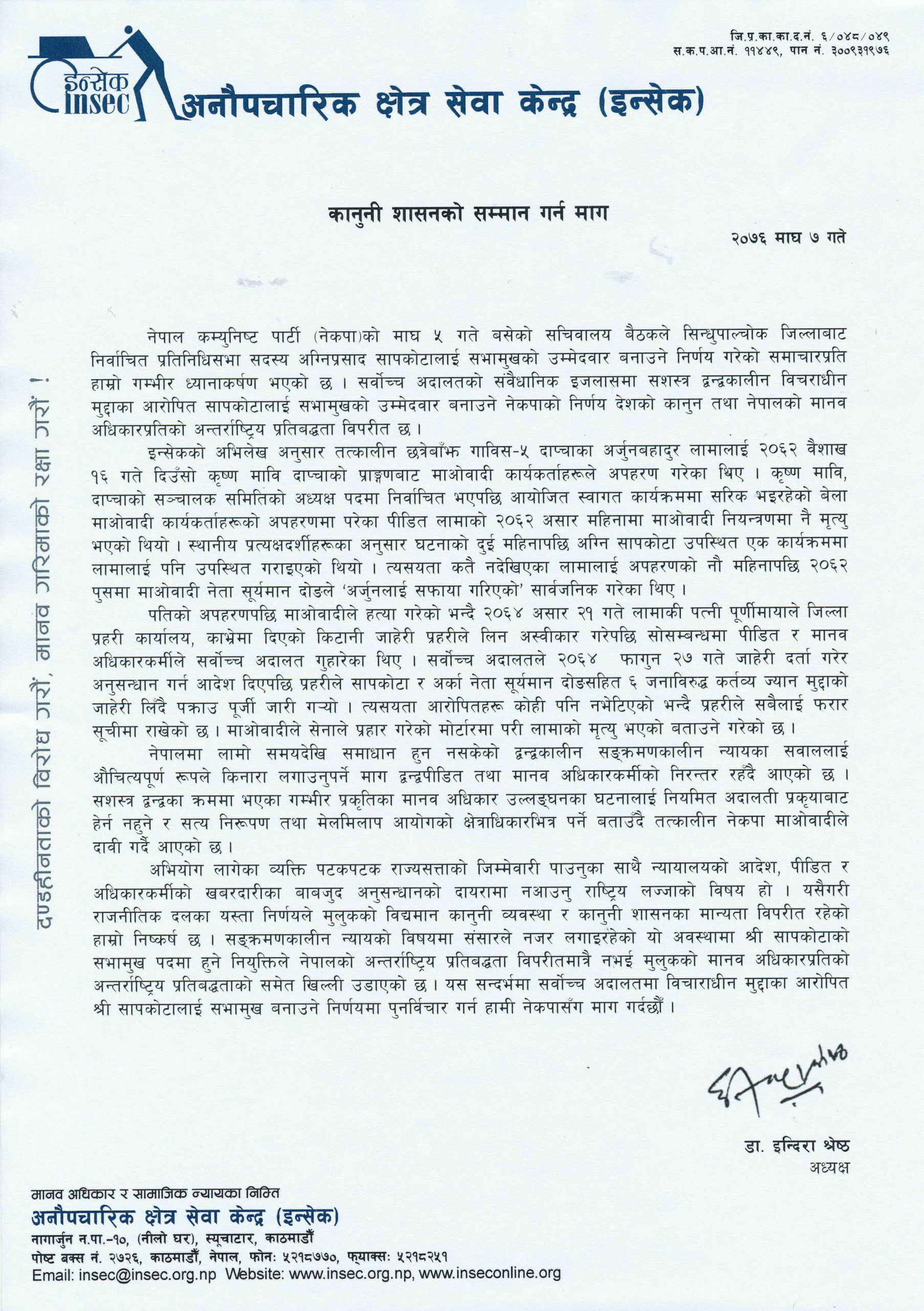 इन्सेककी अध्यक्ष डा इन्दिरा श्रेष्ठद्वारा जारी विज्ञप्तिमार्फत सर्वोच्च अदालतमा विचाराधीन मुद्दाका आरोपित सापकोटालाई सभामुख बनाउने निर्णयमा पुनर्विचार गरी कानुनी शासनको सम्मान गर्न माग गरिएको छ ।