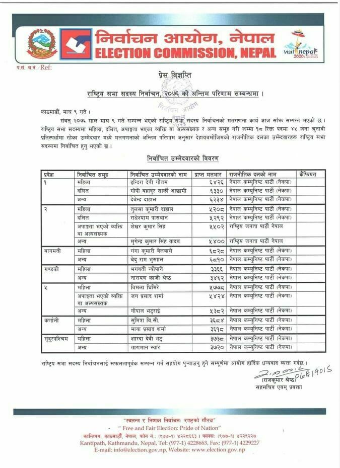 यसैगरी गण्डकी प्रदेशबाट भगवती न्यौपाने र नारायणकाजी श्रेष्ठ विजयी हुँदा प्रदेश नम्बर ५ बाट विमला घिमिरे, गोपाल भट्टराई र जगप्रसाद शर्मा विजयी भए ।