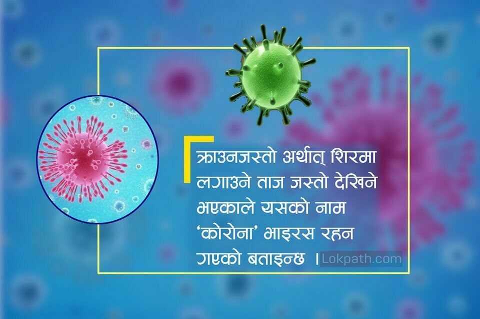 क्राउनजस्तो अर्थात् शिरमा लगाउने ताज जस्तो देखिने भएकाले यसको नाम ‘कोरोना’ भाइरस रहन गएको बताइन्छ ।