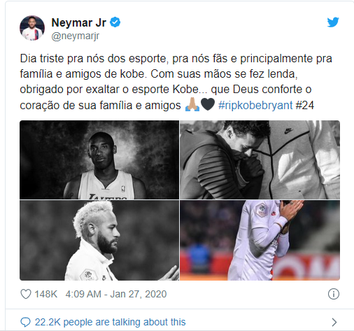 कोबेको मृत्युपछि मृतक बास्केटबल खेलाडी कोबेप्रति नेयमारले लिलीविरुद्धको खेलमा गरेको गोल समर्पण गरेका थिए । विभिन्न फुटबल स्टार खेलाडीले आफ्नो ट्वीटरबाट समबेदना प्रकट गरेका छन् ।
