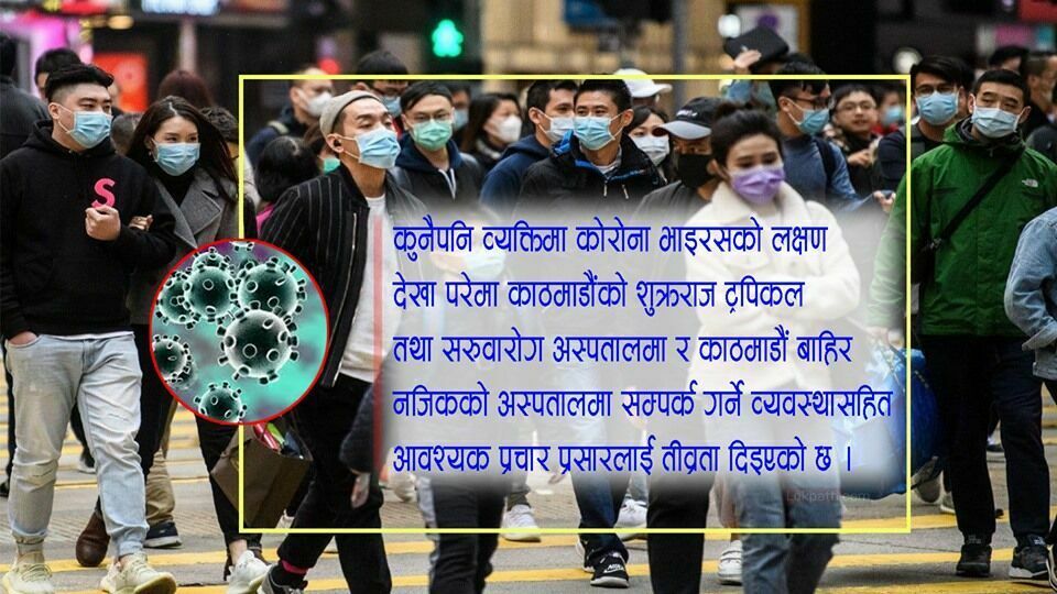 एक जनामा देखिए पनि सङ्क्रमण बढ्नसक्ने आशङ्कामा सरकारले विभिन्न क्षेत्रमा डेस्क स्थापना गरेर सङ्क्रमण फैलन नदिन आवश्यक तयारी थालिसकेको स्वास्थ्य तथा जनसङ्ख्या मन्त्रालयले जानकारी दिएको छ । काठमाडौँ, पोखरा, चितवन, लुम्बिनीलगायत क्षेत्रमा डेस्क नै स्थापना गरेर निगरानी र सतर्कता अपनाउन थालिएको हो । नेपाल भ्रमण वर्ष २०२० का सन्दर्भमा नेपालको पर्यटन क्षेत्र र जनस्वास्थ्यमा यसको नकारात्मक प्रभाव पर्न नदिन अपनाउनुपर्ने पूर्वसतर्कता, जनचेतना र समन्वयका सम्बन्धमा छलफल गरी निर्देशन दिइएको मन्त्रालयका प्रवक्ता रुद्रसिंह तामाङले जानकारी दिए । उनका अनुसार त्रिभुवन अन्तर्राष्ट्रिय विमानस्थलमा (हेल्थ डेस्क) स्वास्थ्य कक्ष स्थापना गरी चीनबाट आएका पर्यटकमा उक्त भाइरसको सङ्क्रमणको अनुमान गर्न निर्देशन दिएको हो ।