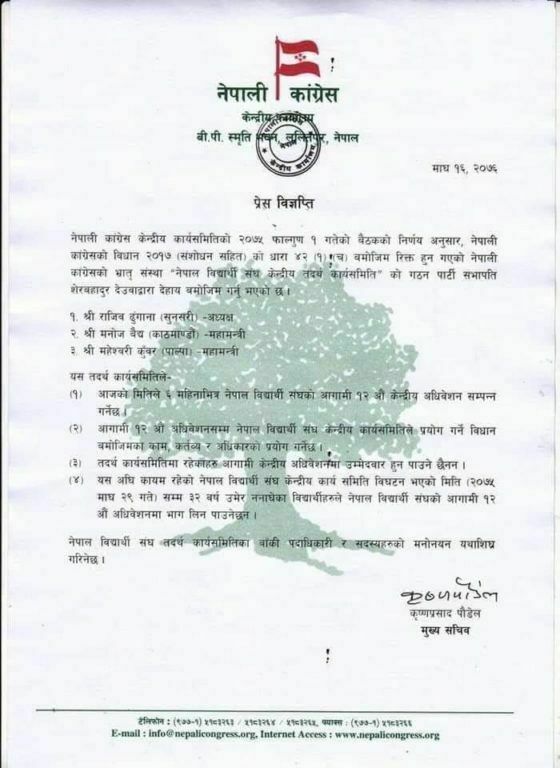 काठमाडौं । नेपाल विद्यार्थी संघ(नेविसंघ)को केन्द्रिय अध्यक्षमा राजिव ढुंगाना चयन भएका छन् । नेपाली कांग्रेस केन्द्रीय कार्यसमितिको २०७५ फाल्गुण १ गतेको बैठकको निर्णय अनुसार पार्टी सभापति शेरबहादुर देउवा नेपाली कांग्रेसको विधान २०१७ (संशोधन सहित) को धारा ४२ (१) (च) बमोजिम रिक्त नेविसंघ केन्द्रीय तदर्थ कार्यसमितिको गठन गरेका हुन् ।