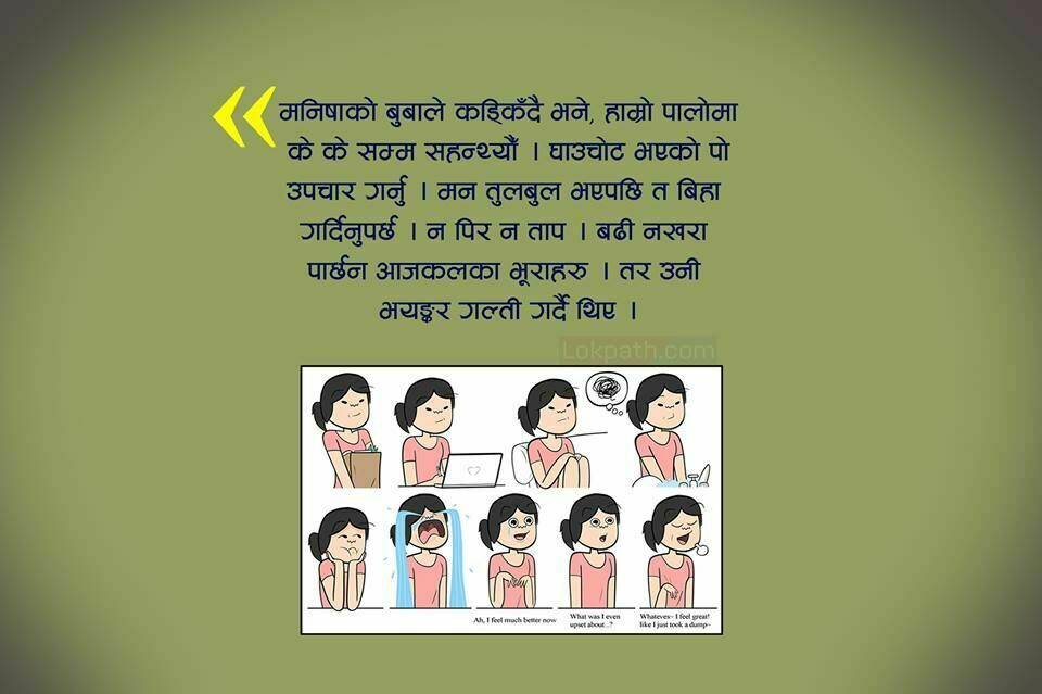 निरज मनिषाको निकै ख्याल गर्छन् । मनिषा कक्षामा प्रथम हुन्छिन् । बिए प्रथम वर्षमा राम्रो अध्ययन गर्ने छोरीमा अचानक आएको यो परिवर्तन पछि परिवारमा डरले डेरा जमाउनु स्वभाविक पनि थियो । तर उनका बुबाको स्वभाव निकै कड्किलो भएका कारण उनी यो कुरा मान्न तयार भएनन् । उनी भन्थे न काम, न पिर न ताप के को तनाव । बढ्ता जान्नी नहोउ । कतिसारो नखरा पार्न परेको आजकलका भुराहरुलाई । खुरुखुरु नपढेर, नौटंकी ।