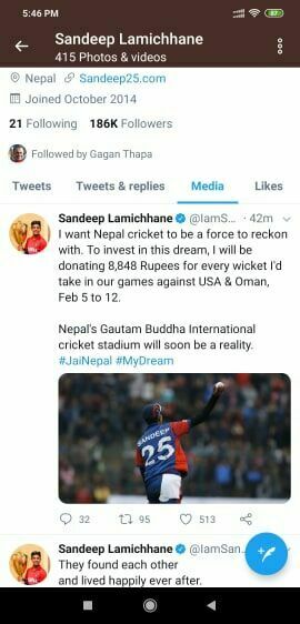 ‘म नेपाल क्रिकेटको एक शक्ति भएको हेर्न चाहान्छु । यो सपनामा लगानी गर्न म अमेरिका र ओमानविरूद्धको खेलमा लिएको प्रत्येक विकेटको लागि ८ हजार ८ सय ४८ रूपैयाँ दिने छु, सन्दीपले ट्वीटरमा लेखेका छन्, नेपालको गौतमबुद्ध अन्तराष्ट्रिय क्रिकेट रंगशाला चांडै यथार्थमा परिणत हुनेछ ।