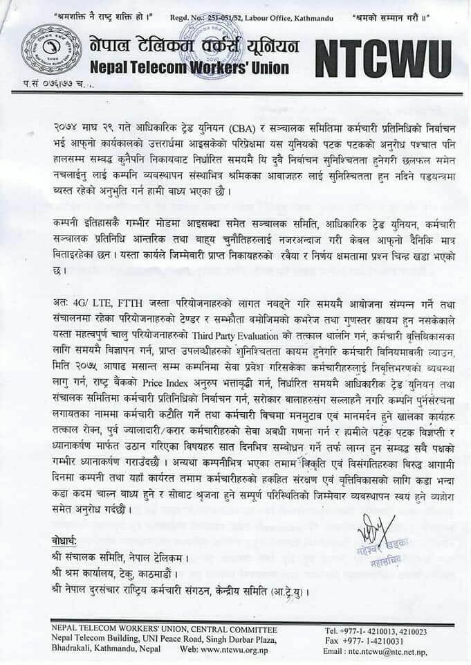 काठमाडौं । नेपाल टेलिकममा कार्यरत नेपाल टेलिकम वर्कस युनियनले विभिन्न माग राखेर विरोधका कार्यक्रम गरेका छन् ।
