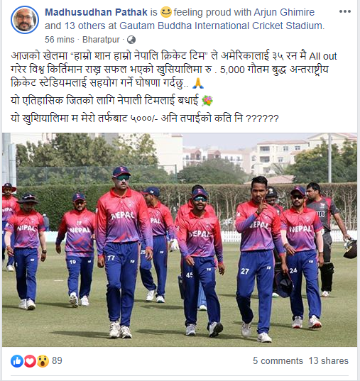 उनले सामाजिक सञ्जाल फेसबूकमार्फत उक्त सहयोग रकमको घोषणा गरेका हुन् । उनले लेखेका छन्, आजको खेलमा हाम्रो शान हाम्रो नेपाली क्रिकेट टीमले अमेरिकालाई ३५ रन मै अलआउट गरेर विश्व कीर्तिमान राख्न सफल भएको खुशियालीमा ५००० गौतम बुद्ध अन्तर्राष्ट्रिय क्रिकेट स्टेडियमलाई सहयोग गर्ने घोषणा गर्दछु । यो ऐतिहासिक जीतको लागि नेपाली टीमलाई बधाई ।