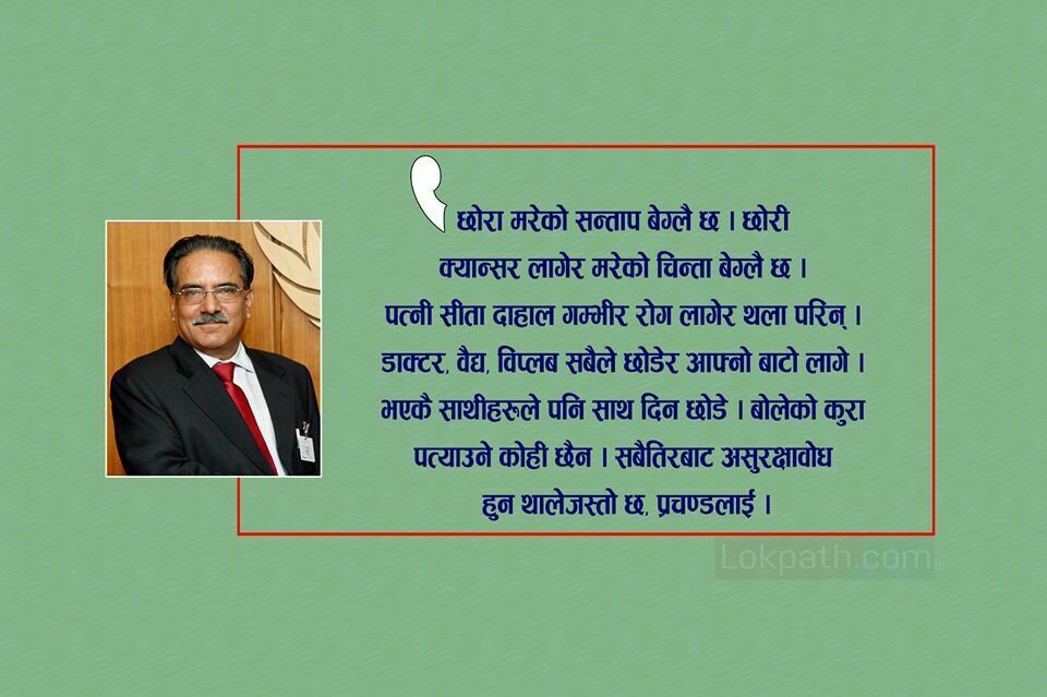 आतंकित मानसिकताले नै त होला, प्रचण्ड हिजोआज विदेश भ्रमणमा निस्कन छोडेका छन् । १० वर्षसम्म सारा नेपालीलाई आतंकित बनाएको शक्तिका नाइके भएर आएका पुष्पकमल दाहाल ऊर्फ प्रचण्ड हिजोआज आफैँ आत्तिएका देखिन्छन् । विगतका आफ्ना कर्तुत आज मानवताविरोधी अपराधका रुपमा जागृत हुनथालेपछि उनी अत्तालिएका हुन् । छोरा मरेको सन्ताप बेग्लै छ । छोरी क्यान्सर लागेर मरेको चिन्ता बेग्लै छ । पत्नी सीता दाहाल गम्भीर रोग लागेर थला परिन् । डाक्टर, वैद्य, विप्लब सबैले छोडेर आफ्नो बाटो लागे । भएकै साथीहरूले पनि साथ दिन छोडे । बोलेको कुरा पत्याउने कोही छैन । सबैतिरबाट असुरक्षावोध हुन थालेजस्तो छ, प्रचण्डलाई ।