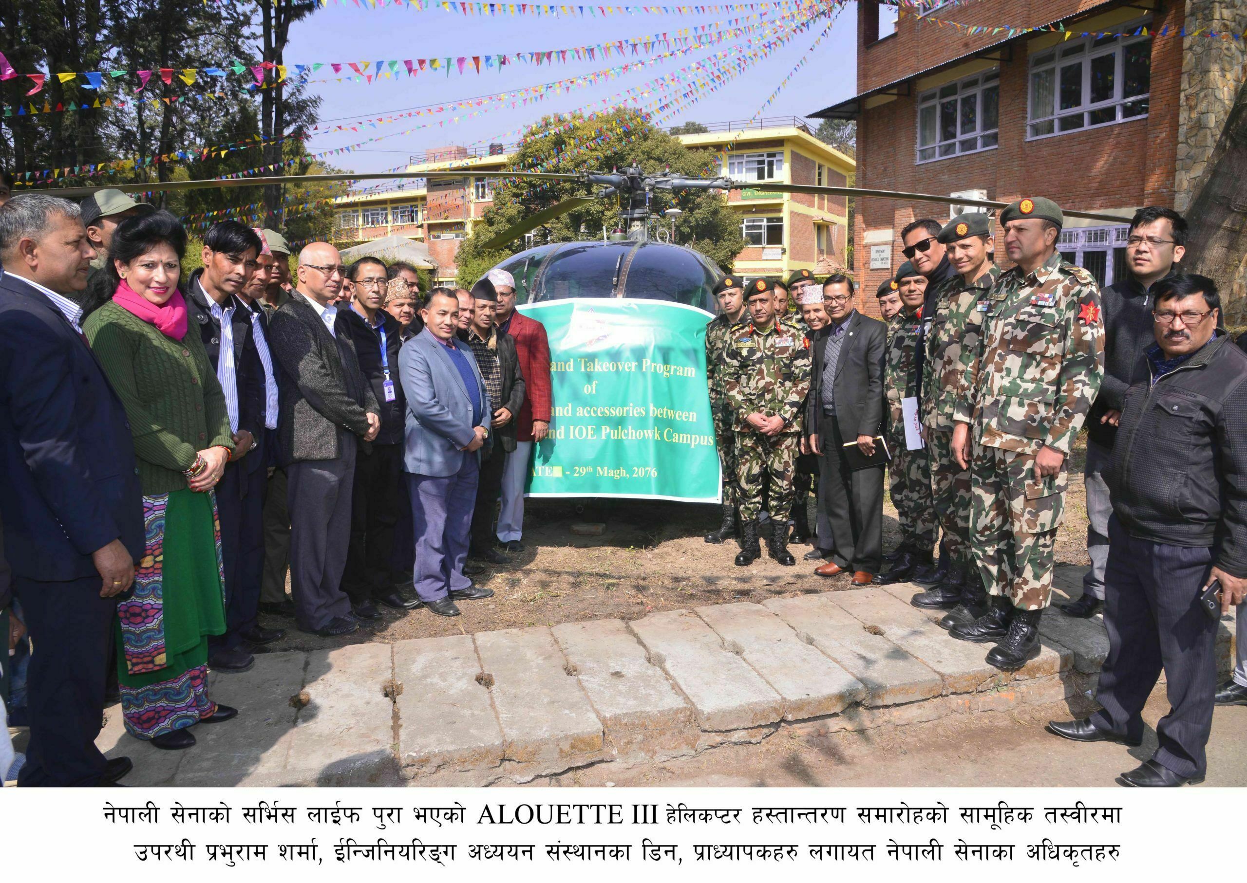 काठमाडौँ । नेपाली सेनाले सर्भिस लाईफ पूरा भएको हेलिकप्टर तथा सो हेलिकप्टरसंग सम्बन्धित बिओन्ड इकोनोमिक रिपेयर भएका पार्टपूर्जा त्रिभुवन विश्वविद्यालय ईन्जिनियरिङ्ग अध्ययन संस्थान (पुल्चोक क्याम्पस) लाई दिएको छ ।