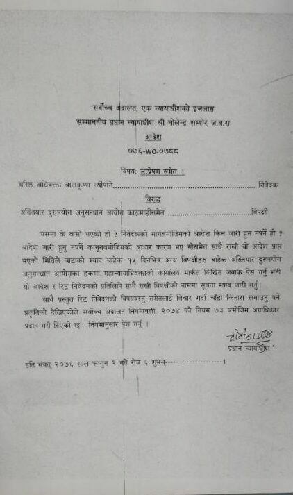 प्रधानन्यायाधीश चोलेन्द्रशम्शेर जबराको एकल इजलासले १५ दिन भित्र लिखित जवाफ पेश गर्न अख्तियार दुरुपायोग अनुसन्धान आयोगलाई आदेश जारी गरेको छ ।