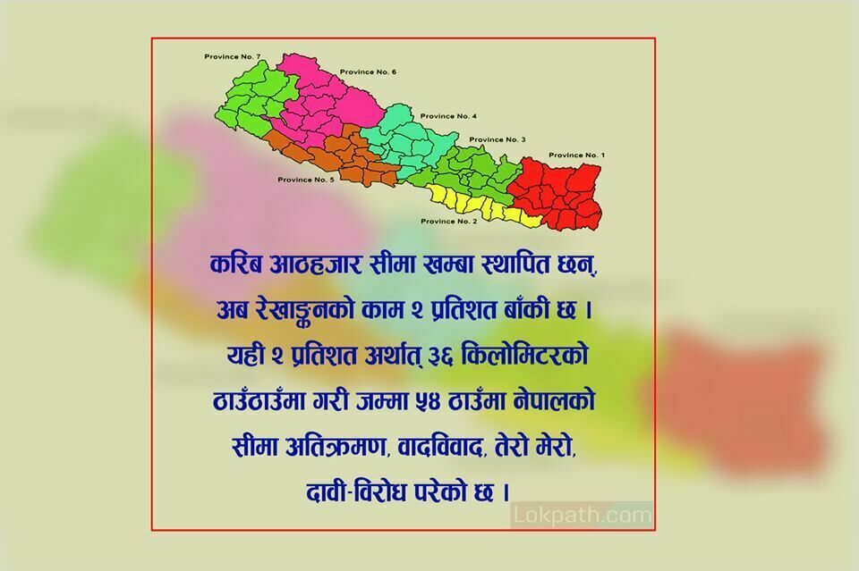 संघीय राज्य संरचनाको काम थाल्नुअघि देशको सीमा–विवाद वा मामिला सल्ट्याउनु पर्नेथियो, जो आज गम्भीर हुन थालेको छ । कालापानी क्षेत्र भारतले आफ्नो राजनीतिक नक्सामा गाभेको र सुस्ता लगायतका समस्याहरू ज्युँकात्युँ छन् । सीमाविद्ले दिएको तथ्याङ्कअनुसार १८शय ८ किलोमिटर लामो नेपाल–भारत सीमा रेखाङ्कनको ९८ प्रतिशत काम सकिएको छ । यसअनुसार एकशय ८२ थान सीमा नक्सा तयार भएको छ । करिब आठहजार सीमा खम्बा स्थापित गरिएका छन्, अब रेखाङ्कनको काम २ प्रतिशत बाँकी छ । यही २ प्रतिशत अर्थात ३६ किलोमिटरको ठाउँठाउँमा गरी जम्मा ५४ ठाउँमा नेपालको सीमा अतिक्रमण, वादविवाद, तेरोमेरो, दावी–विरोध परेको छ । यसमध्ये, कालापानी–लिम्पियाधूरा, सुस्ता, सन्दकपुर, मानेभञ्ज्याङ्,परासन, लालबोझी, भजनी, चौगुर्जी, कोरोबारी, भद्रपुर, मेची पुल आदिमा जटिलता रहेको छ । भारतसँग साँध जोडिएको नेपालको २६ मध्ये २१ जिल्लाका ५४ ठाउँमा करिब ६० हजार हेक्टर भूमिमा सीमा विवाद छ ।