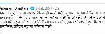 सामाजिक सञ्जालमार्फत बाबुरामले सत्य पनि यही भएको भन्दै सार्वजनिक जिम्मेवारी बहन गर्ने व्यक्ति निजी जीवनमा पनि सतर्क रहनुपर्ने बताएका छन् ।